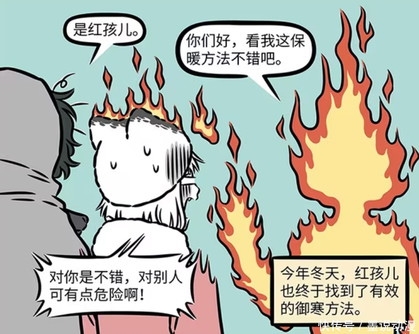 其实就是红孩儿,还是白泽靠近他之后才知道真相。红孩儿觉得自己变成火人之后,取暖方式很特别。九月觉得红孩儿太过危险,帽子已经被三昧真火点燃,如果让它继续燃烧,九月都有生命危险。红孩儿是找到了自己的取暖方式,可是旁人就危险万分。