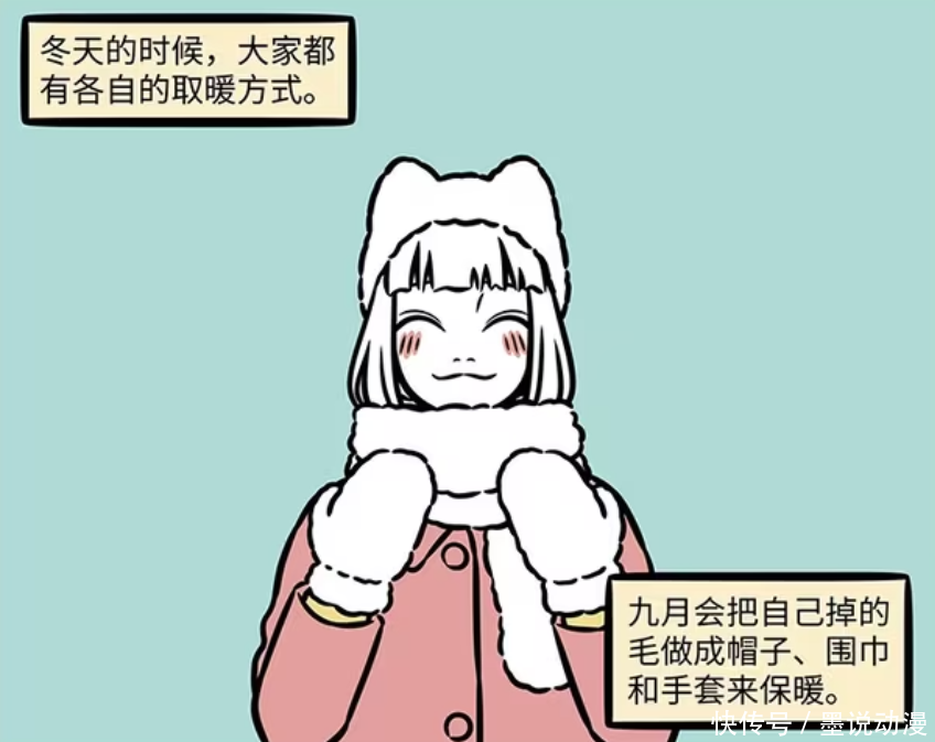 北京的冬天还是比较冷,九月在这里生活了十几年,早就有自己那一套取暖方式。九月会将自己掉下来的毛发,做成帽子、围巾和手套,这样戴在身上就会很暖和。另外九尾狐毛发做成的这些御寒之物,还能让九月看起来更加可爱。